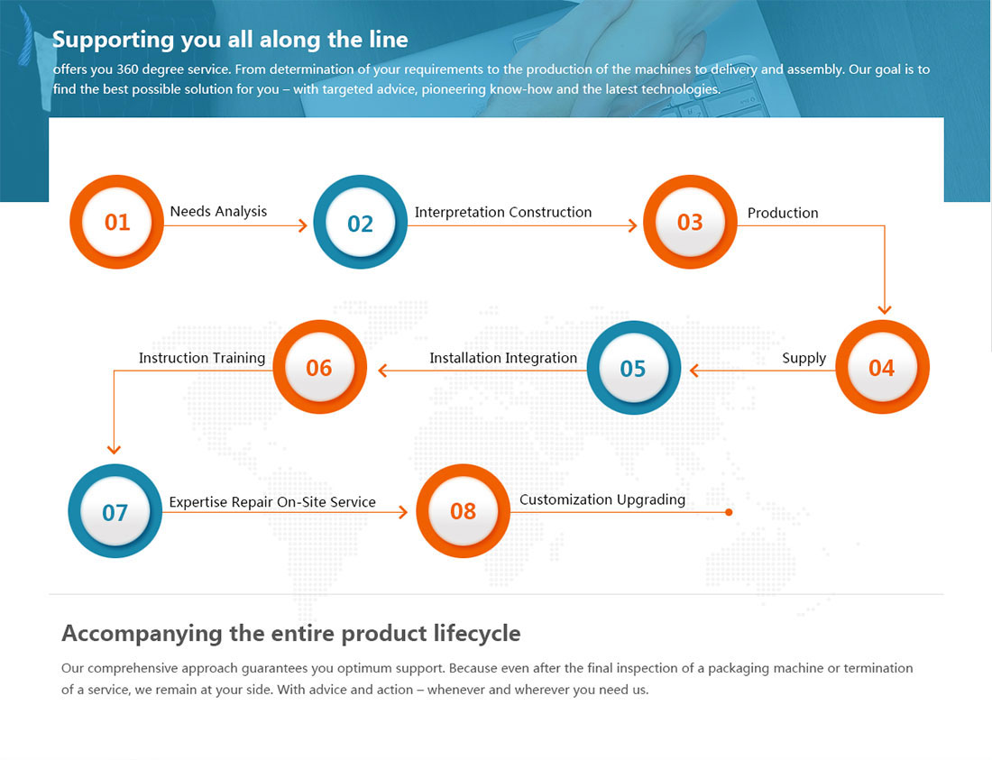 我們?nèi)娴姆椒ūWC您獲得更好的售后支持 因?yàn)榧词乖谧罱K檢查包裝機(jī)或終止服務(wù)之后,我們?nèi)匀辉谀磉叀?通過(guò)建議和行動(dòng) - 無(wú)論何時(shí)何地,只要您需要我們。
